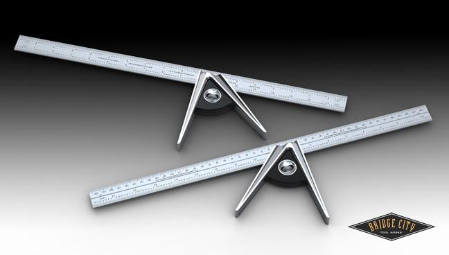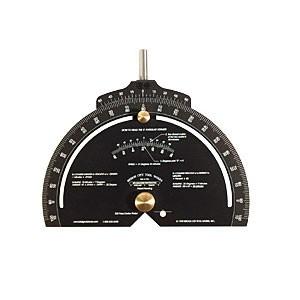 The BP-18 Bevel Protractor uses an eighteen inch indicator. Made from the same hardened and plated steel as the protractor plate, this pivot arm contains the hairline cursor (beveled to avoid parallax errors) by which you set angles. The length of this arm will allow you to layout many of your angles directly without the need of transferring to another bevel. This saves you time, improves your accuracy and is particularly useful in setting up table saw miter gages!