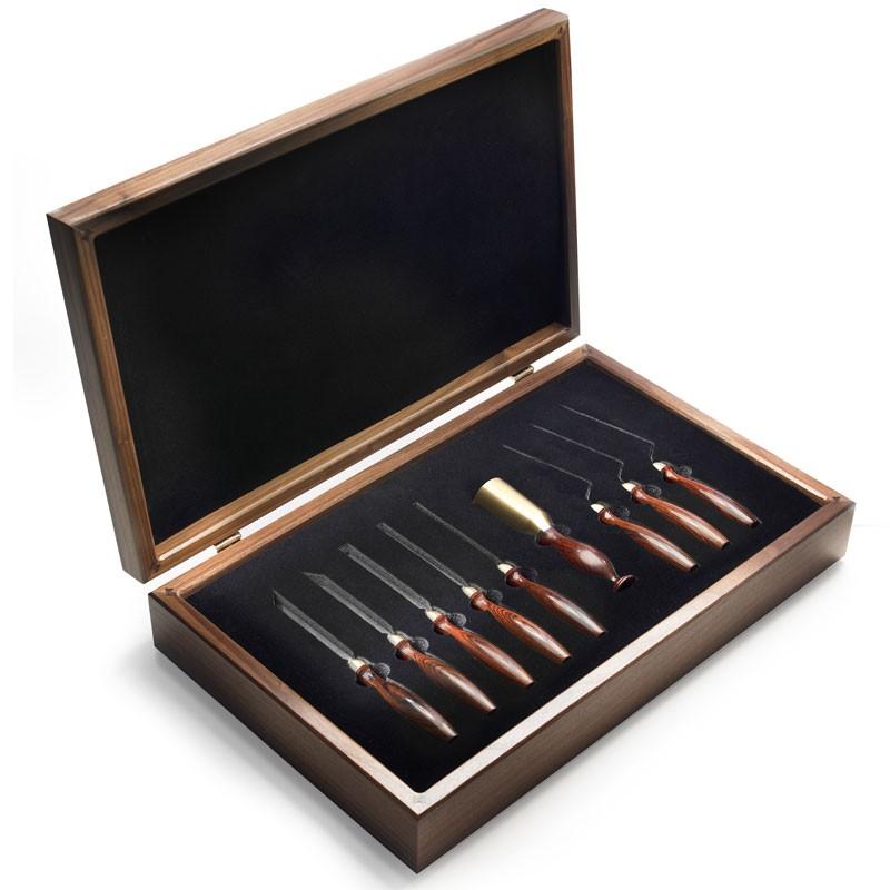 The CT-13 8-Piece Chisel Set is a beautiful and logical choice for all the tasks where your other chisels are inadequate. Hand work, in my opinion, is the most rewarding aspect of being a woodworker, and this set of specialty chisels will definitely make your woodworking experience richer. They are a joy visually and will quickly prove themselves indispensable. As with all tools in the Commemorative Tool series, this set is produced just once and available exclusively to Founder's Circle Members.Each chisel feels and works superbly in your hands and is equally trustworthy when persuaded by a mallet. Each limited-edition CT-13 8-Piece Chisel Set will arrive nested in a liner that helps protect your investment from inadvertent damage.