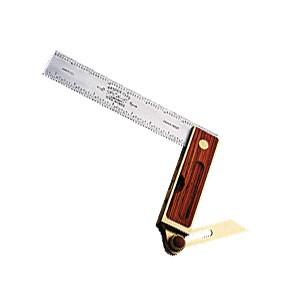 The AS-24 Adjustable Angle Square consists of a blade, handle and a solid brass turned knob. The blade is 24" long, satin chrome plated, one and one-half inches wide by .080" thick. The handle is solid rosewood, faced with brass wear plates which are secured with an adhesive and flush set screws. The handle is fastened to the blade in a "T" formation (similar to a draftsman's T-square). This allows you to lay out lines from the extreme right of your stock to the extreme left without flipping the square over-this eliminates the problem if drawing converging lines which occurs from the error factor of all squares. Now here is the neat part. Simply turn the square over so the brass knob is up. At first glance the square appears exactly as it did seconds ago. Now loosen the knurled knob (which has a perfectly executed Brazilian kingwood inlay in the top), and you know have an adjustable square with a full 180 degrees if infinite adjustment. The fixed 90 degree handle is now on top. What this means is that if you set the blade at 60 degrees, this square will automatically provide the complementary angle of 30 degrees! You can adjust this square to any angle you want (we recommend using a protractor head), tighten the knob and the angle is firmly secured. Flip the tool over and you have the accurate (plus or minus .006" over 24") fixed 90. Flip it back and your previously set angle is raring to go. This is two squares simultaneously!