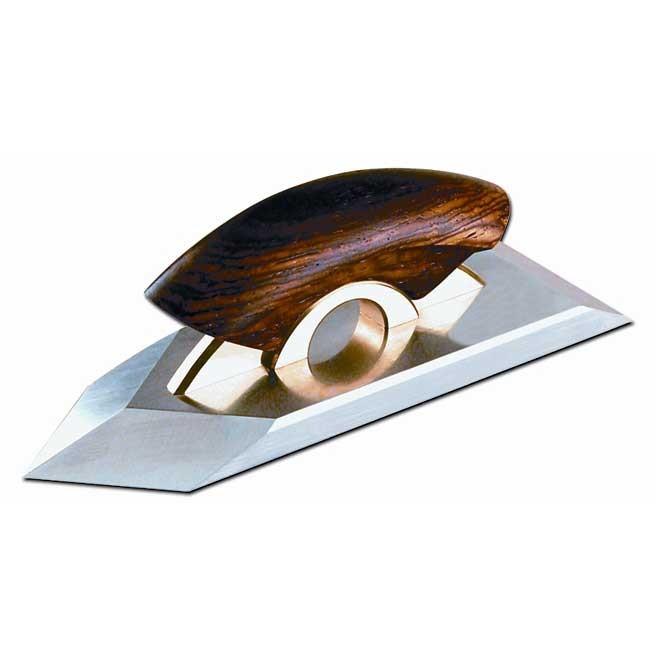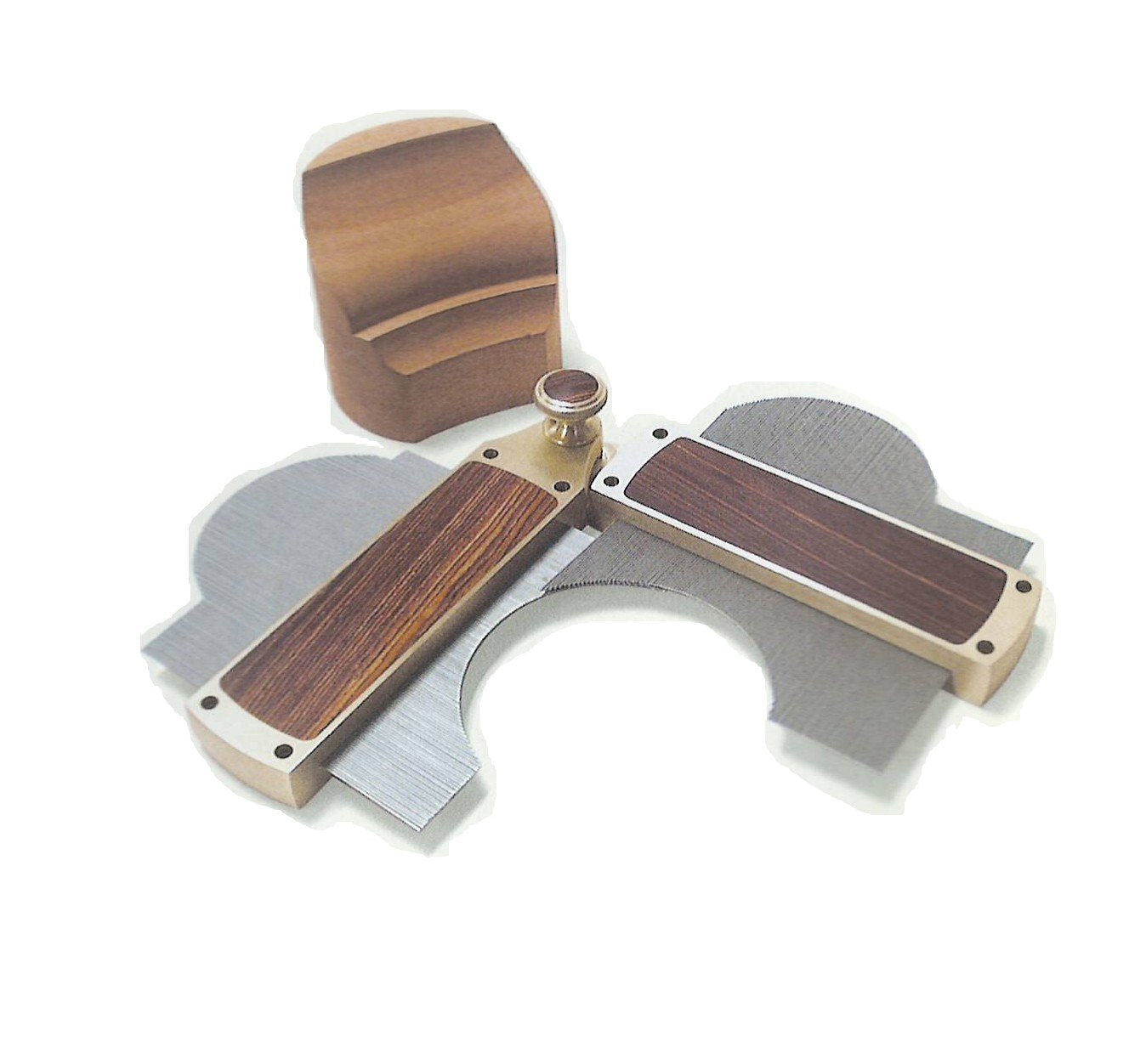 Cutting perfectly centered crowns is quite easy with a properly adjusted fence. This dramatic visual element of the tool performs flawlessly. Cast from silicon brass, the fence is powder-coated and then dressed to reveal the plane profile motif. It is very striking and worthy of a collector quality plane. The removable fence travels on two steel rods and is locked in place with our trademark brass knobs that are infilled with either rosewood or ebony.