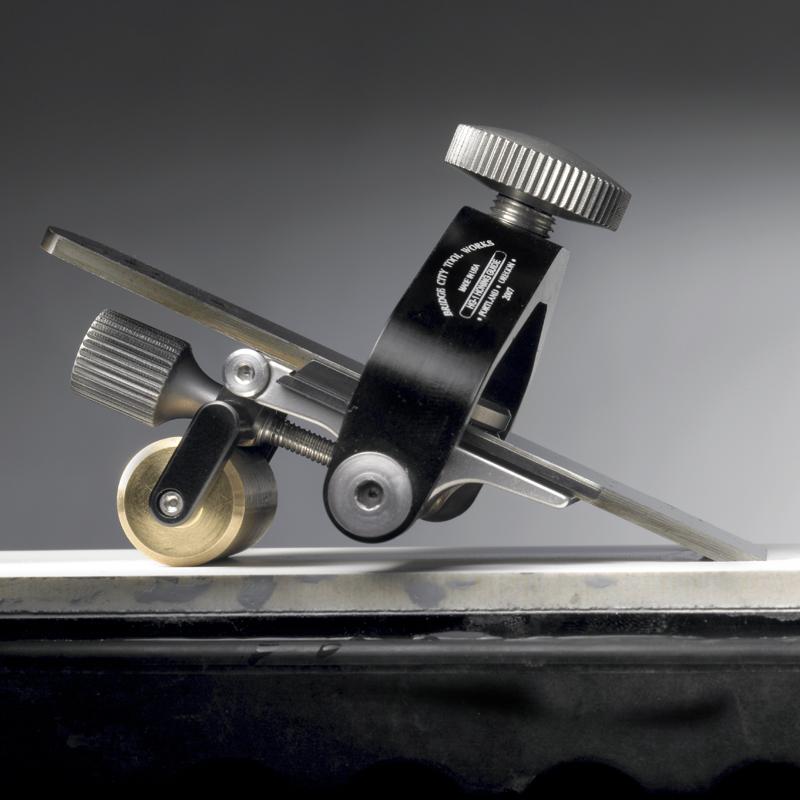 The Set Up gauge comes marked with 20, 25, 30, and 35 degree angles. Once the blade is clamped into the HG-1 to an angle close to what you want on the Set-Up Gauge, you can fine tune the angle with the precise rear knob. Check the squareness of the cutting edge with the built-in T-square. The HG-1 will handle blades up to 2-3/8" wide. Now you can smoothly sharpen your blade through all of the grits you need. If you desire a micro-bevel on the edge, simply turn the rear wheel. No other blade adjustments necessary. One revolution of the knob adjusts the blade angle just under 1 degree.