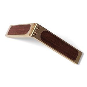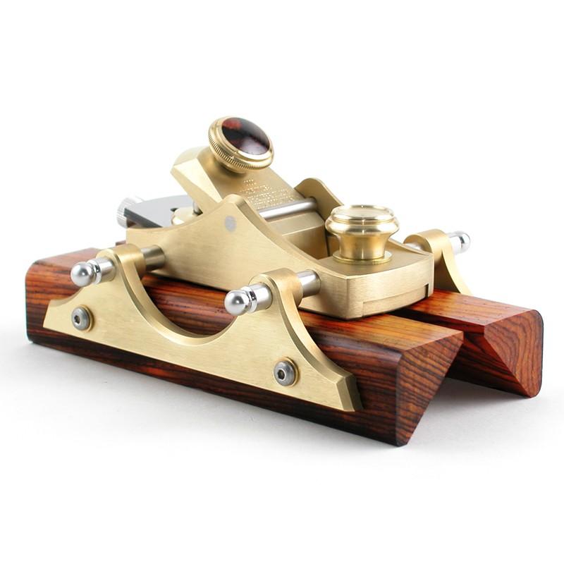 The HP-4 Chamfer Plane is an adjustable throat, low angle plane milled from a solid billet of 360 brass alloy. The iron is A2 steel lapped, cyrogenically treated and hardened to RC 60-62. The solid brass fences are facd with rosewood rails sliding on stainless steel guides. The overall length with the fences attached is 5". The cap iron has a rosewood infill.