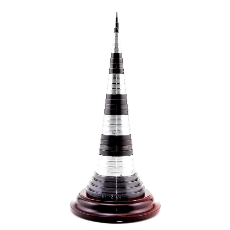 The TT-1 Turning Tree is made in nine sections. Individual sections can be removed and kept in your apron pocket as quick references until your turning job is completed. We recommend you don't place this precision tool on the outboard end of your lathe while you turn, lest it vibrate onto the floor. All sections nest together, sturdy as a tree, awaiting your calipers. The major diameter of each section is permanently marked with the diameters of all four cylinders which make up that particular section. You'll know at a glance which section contains the diameter to match the drill you used to make the mortise. Additionally, the TT-1 Turning Tree sections can be used to size existing holes. Simply grab the section which closely resembles the hole you wish to measure and drop the narrow end into the hole until you find the size which fits. This can be extremely helpful in repairing antiques or making replacement parts.